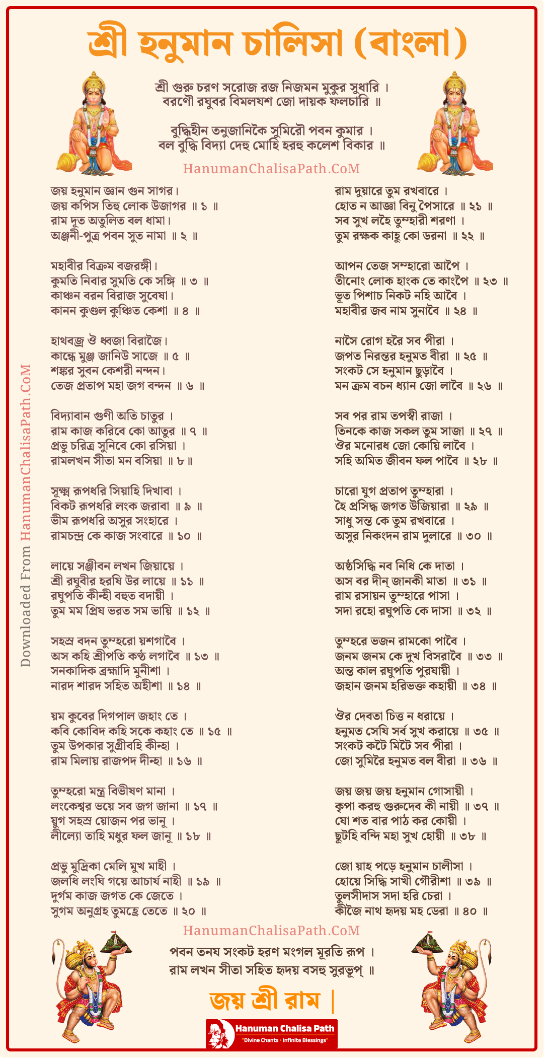 হনুমান চালিশা (বাংলা) – Hanuman Chalisa In Bengali PDF Download: হনুমান চালিসা একটি খুবই পরিচিত হিন্দু ধর্মীয় গ্রন্থ, যা ভগবান হনুমানের মহিমা ও গুণাবলির প্রশংসা করে। এটি মহান কবি তুলসীদাস দ্বারা রচিত এবং এতে রামায়ন সম্পর্কিত অনেক গুরুত্বপূর্ণ বিষয় উল্লেখ করা হয়েছে। হনুমান চালিসার পাঠ করার সময়, আমরা হনুমানji-র উদার গুণাবলির যেমন সম্মান, বিশ্বাস এবং ধৈর্যের আরাধনা করি। এটি হিন্দু ধর্মে একটি গুরুত্বপূর্ণ ও পবিত্র বই হিসেবে বিবেচিত।