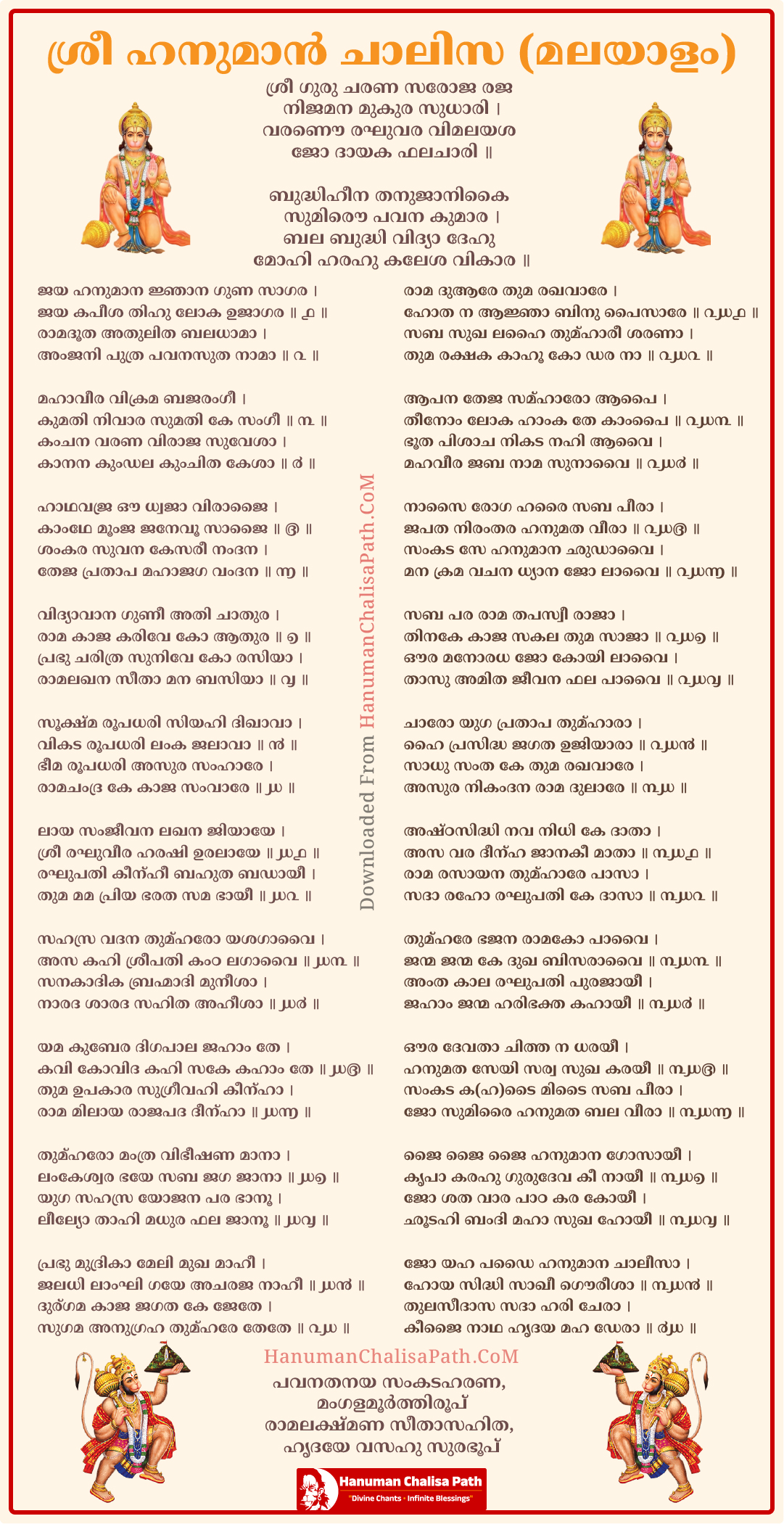 Hanuman Chalisa In Malayalam PDF Download – ഹനുമാൻ ചാലീസ ഹിന്ദുമതത്തിൽ ഏറ്റവും പ്രശസ്തമായ ഭജനങ്ങളിലൊന്നാണ്. ഇത് ശ്രീ ഹനുമാന്റെ ശക്തിയും മഹിമയും പാടുന്ന ഒരു മനോഹരമായ ഗാനം ആണ്. 16-ാം നൂറ്റാണ്ടിൽ കവി തുൽസീദാസ് ഈ ഭജനം എഴുതി. അതിൽ 40 ശ്ലോകങ്ങൾ ഉണ്ട്, അതുകൊണ്ടാണ് ഇതിന് “ചാലീസ” എന്ന പേര് വന്നത് (ചാലീസ് അർത്ഥം 40 എന്നാണ്).